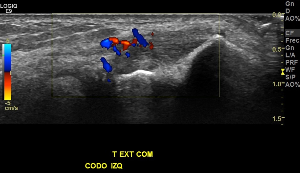 Hallazgos: marcada heterogeneidad de tendón extensor común izquierdo, con foco de desgarro de espesor y ancho parcial en su espesor, con hiperemia al doppler color.